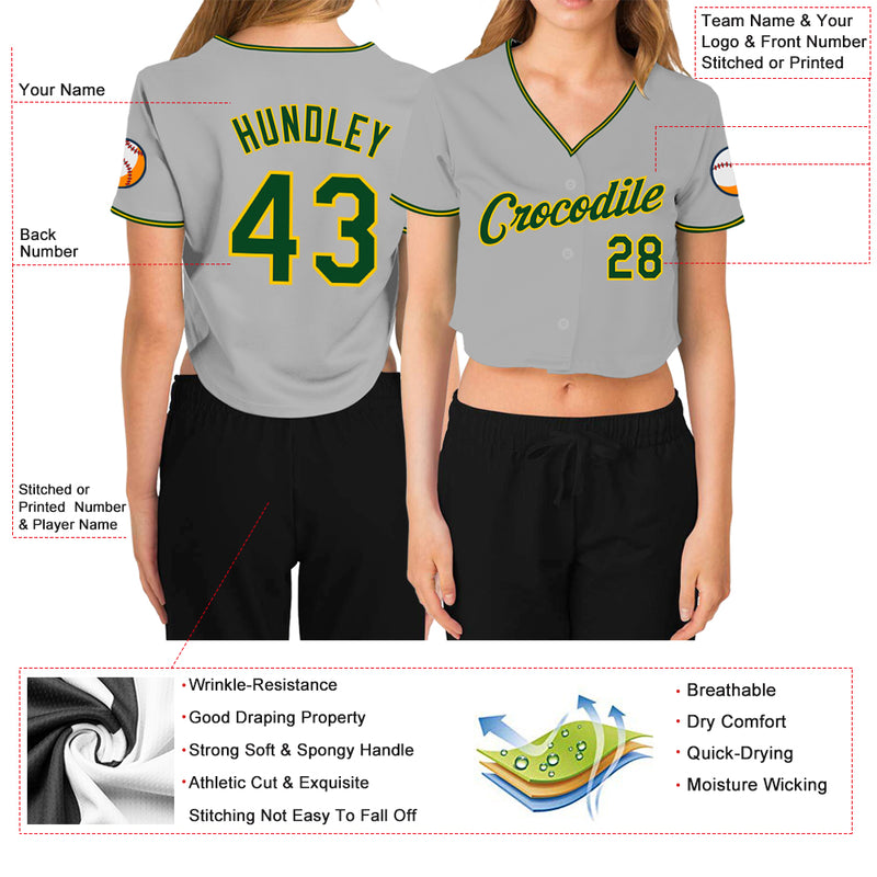 Custom Women's Gray Green-Gold V-Neck Cropped Baseball Jersey