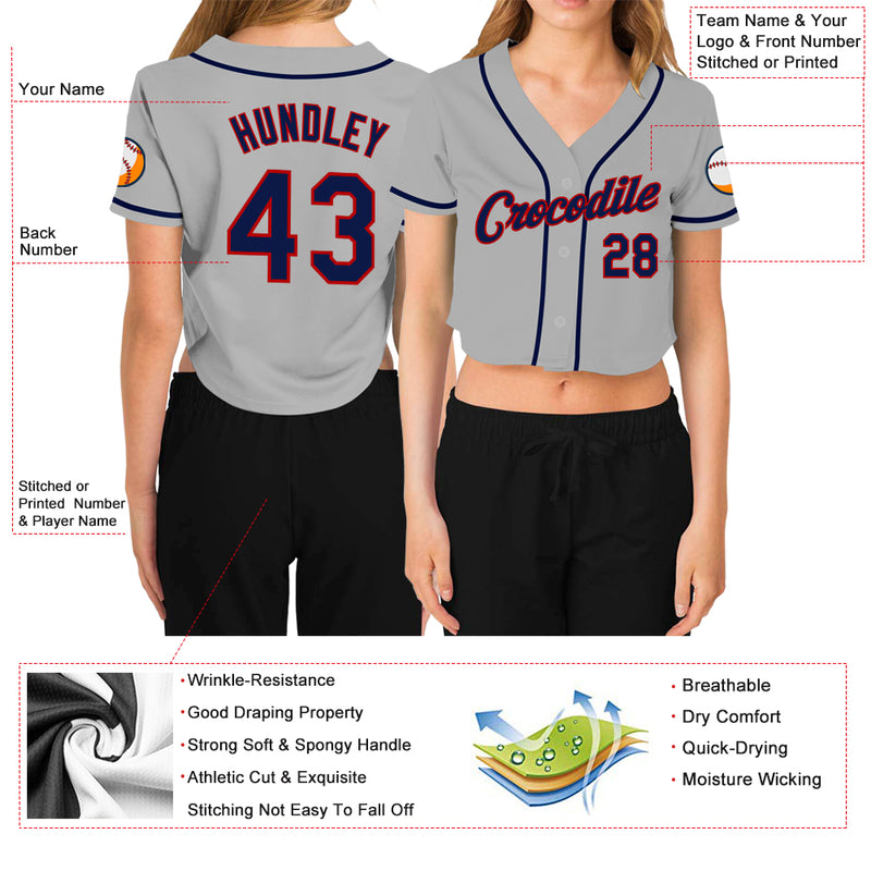 Custom Women's Gray Navy-Red V-Neck Cropped Baseball Jersey