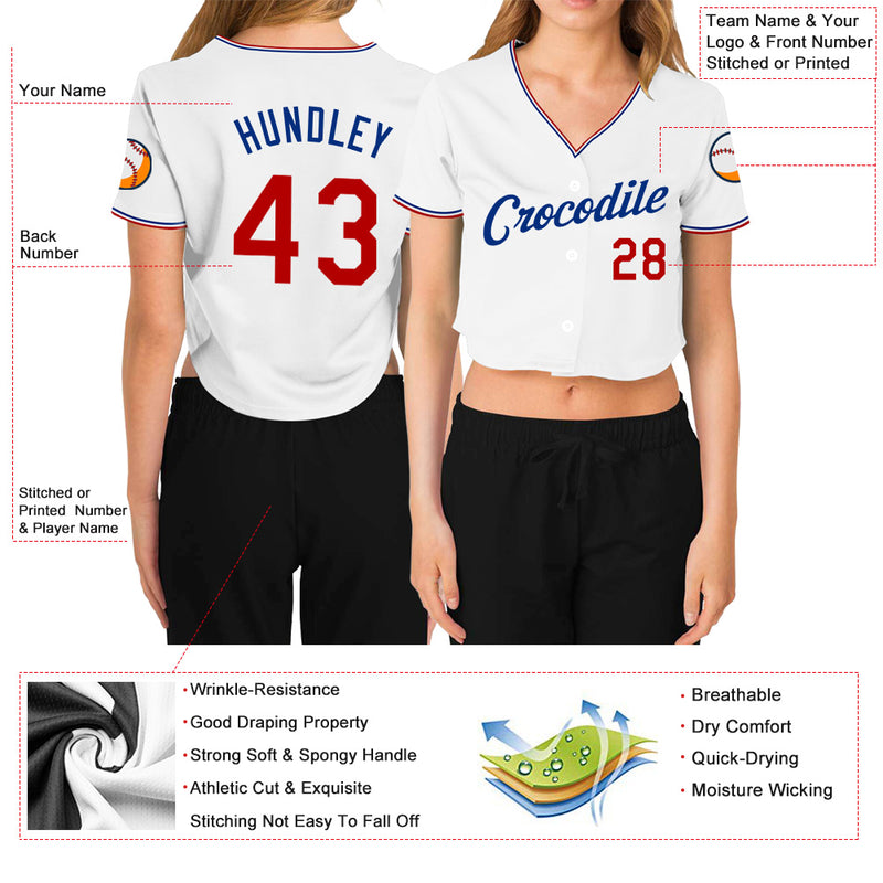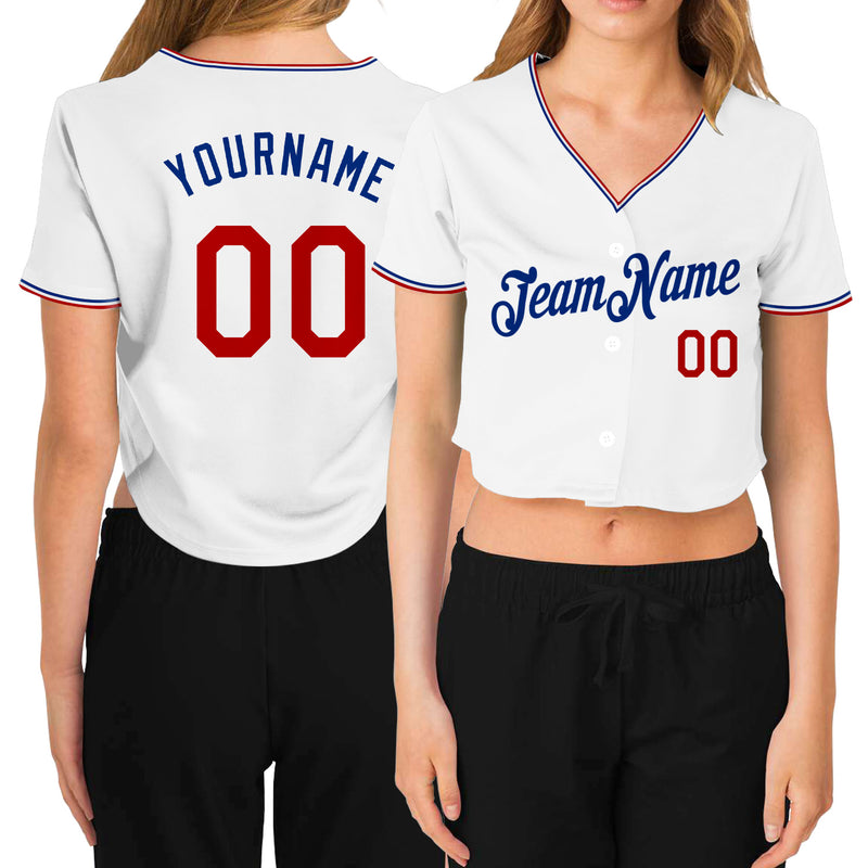 Custom Women's White Red-Royal V-Neck Cropped Baseball Jersey