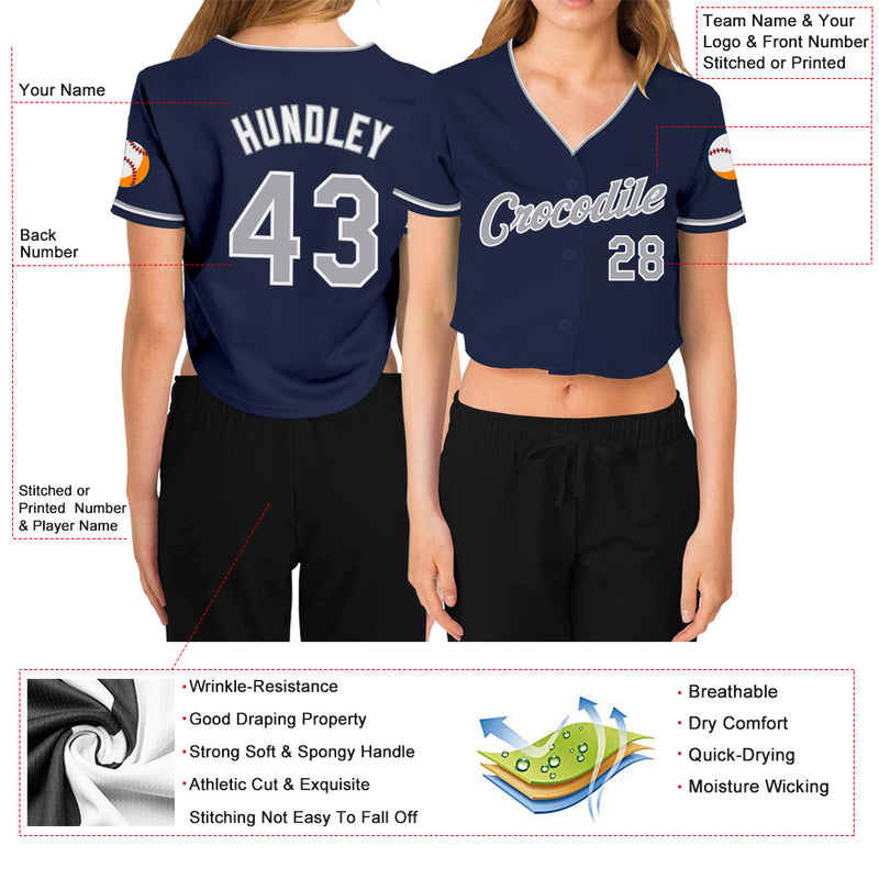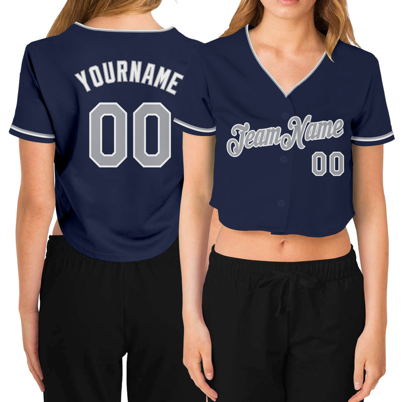 Custom Women's Navy Gray-White V-Neck Cropped Baseball Jersey