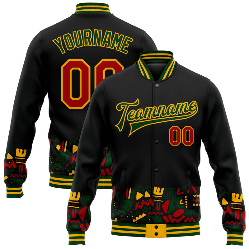 Custom Black Red Gold-Green Black History Month 3D Pattern Design Bomber Full-Snap Varsity Letterman Jacket