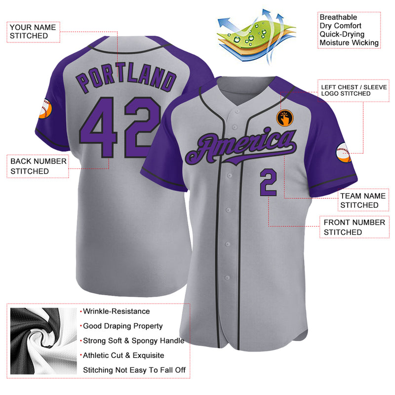 Custom Gray Purple-Black Authentic Raglan Sleeves Baseball Jersey
