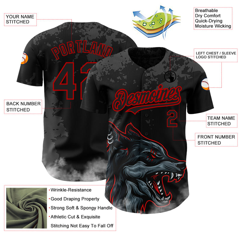 Custom Black Red 3D Pattern Design Animal Wolf Authentic Baseball Jersey
