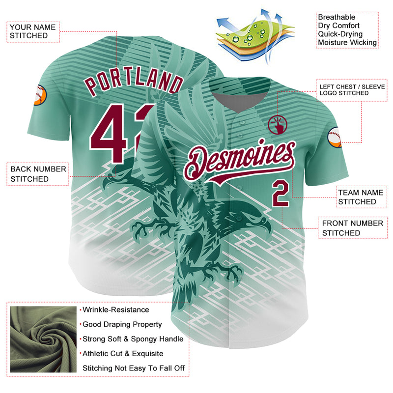 Custom Teal Crimson-White 3D Pattern Design Animal Eagle Authentic Baseball Jersey
