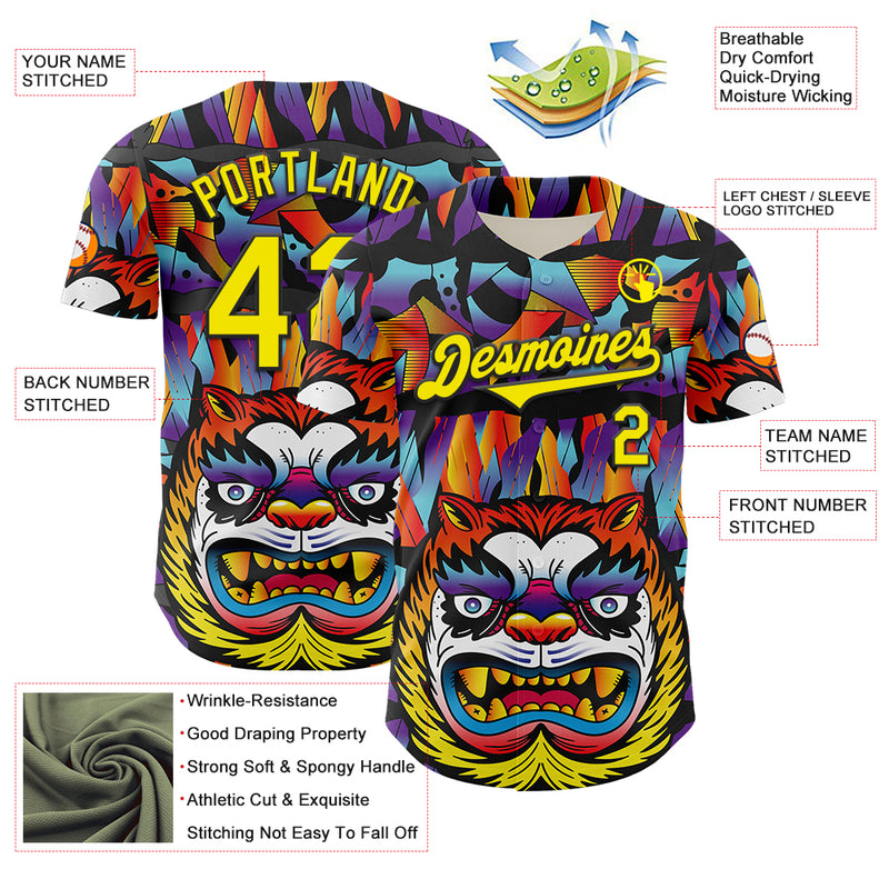 Custom Black Light Yellow 3D Geo Law Tiger Mask Authentic Baseball Jersey