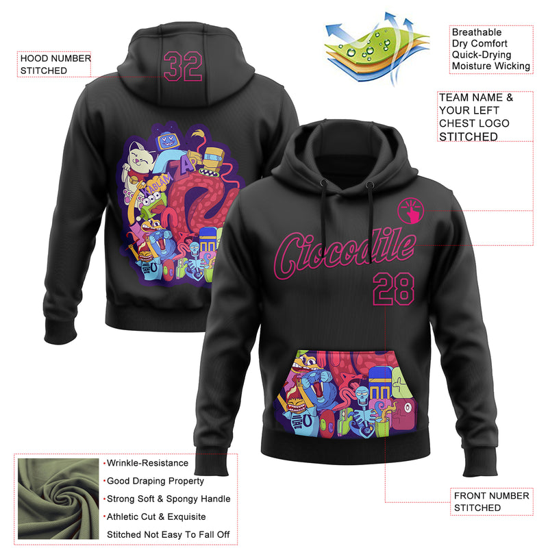 Custom Stitched Black Hot Pink 3D Vaunsart Messy Party Sports Pullover Sweatshirt Hoodie