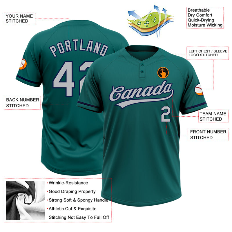 Custom Teal Gray-Navy Two-Button Unisex Softball Jersey