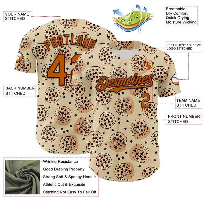Custom Cream Texas Orange-Brown 3D Pattern Design Foodie Food Snack Chocolate Cookie Authentic Baseball Jersey