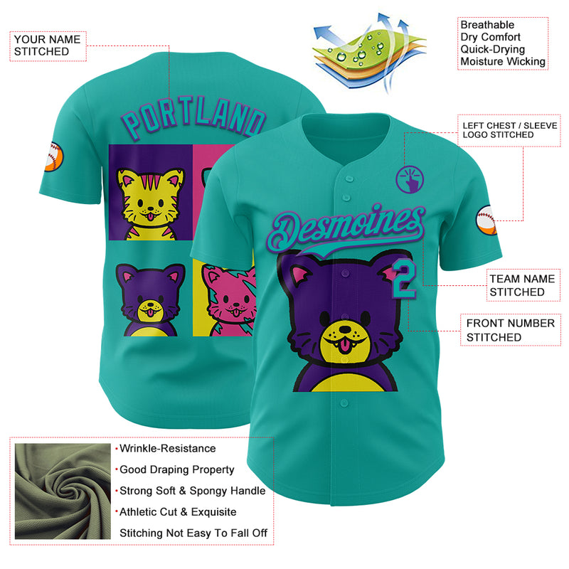 Custom Aqua Aqua-Purple 3D Tobe Fonseca Cat Warhol Pop Art Authentic Baseball Jersey