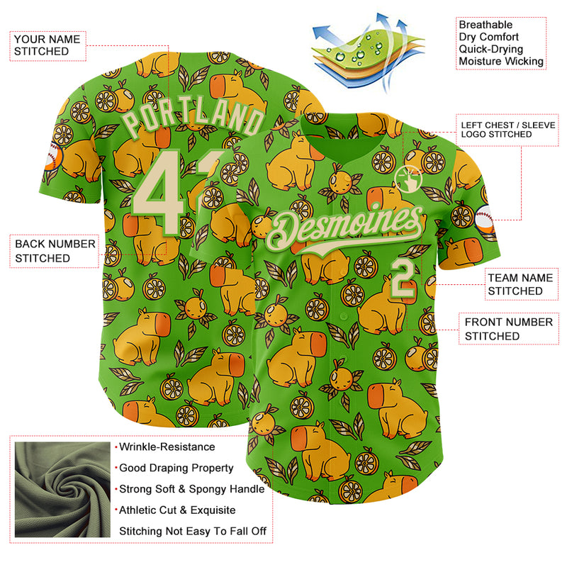 Custom Aurora Green Cream-Aurora Green 3D Tobe Fonseca Capybara With Oranges Leaves Green Authentic Baseball Jersey