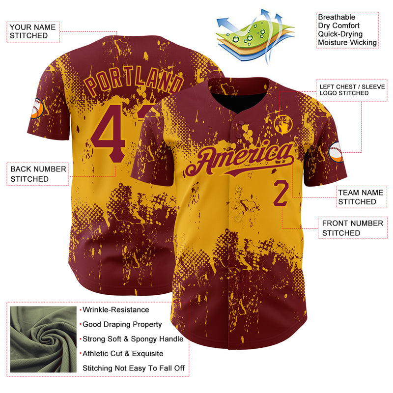 Custom Crimson Gold 3D Pattern Design Abstract Splatter Grunge Art Authentic Baseball Jersey