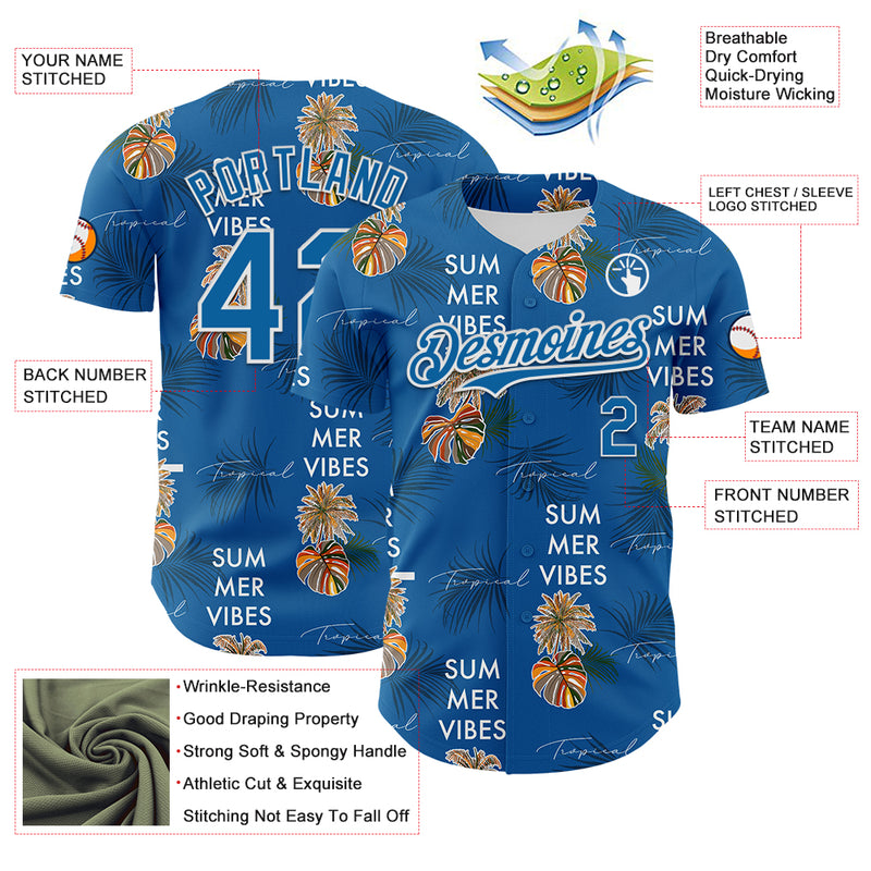 Custom Blue White 3D Hawaii Tropical Leaves Summer Vibes Authentic Baseball Jersey