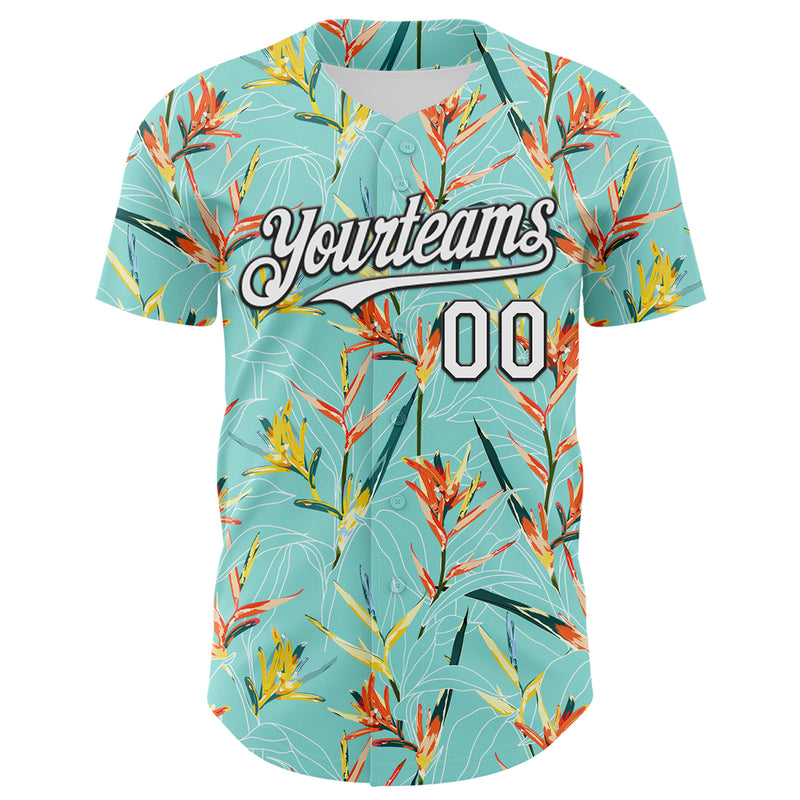 Custom Ice Blue White-Black 3D Hawaii Tropical Leaves Authentic Baseball Jersey
