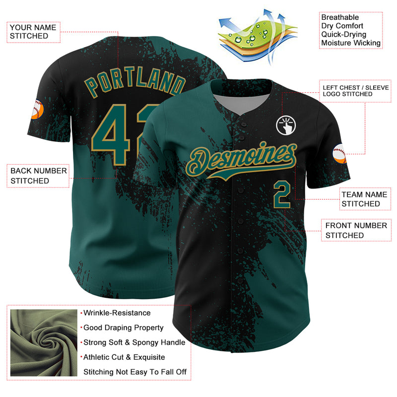Custom Midnight Green Black-Old Gold 3D Pattern Design Abstract Brush Stroke Authentic Baseball Jersey