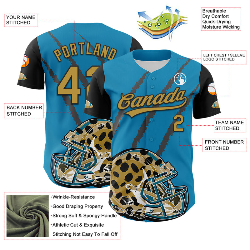 Custom Panther Blue Old Gold-Black 3D Pattern Design Football Jaguar Helmet And Animal Claw Authentic Baseball Jersey