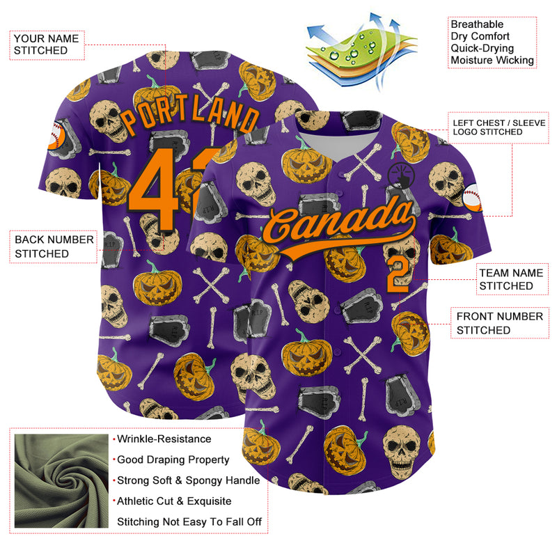 Custom Purple Bay Orange-Black 3D Pattern Halloween Skull Authentic Baseball Jersey