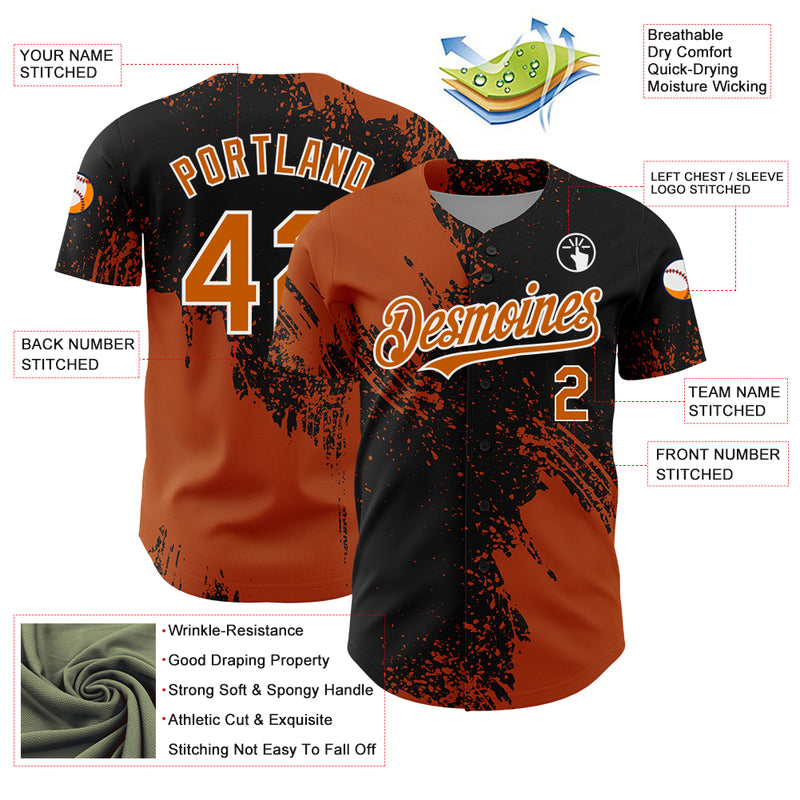 Custom Texas Orange Black-White 3D Pattern Design Abstract Brush Stroke Authentic Baseball Jersey