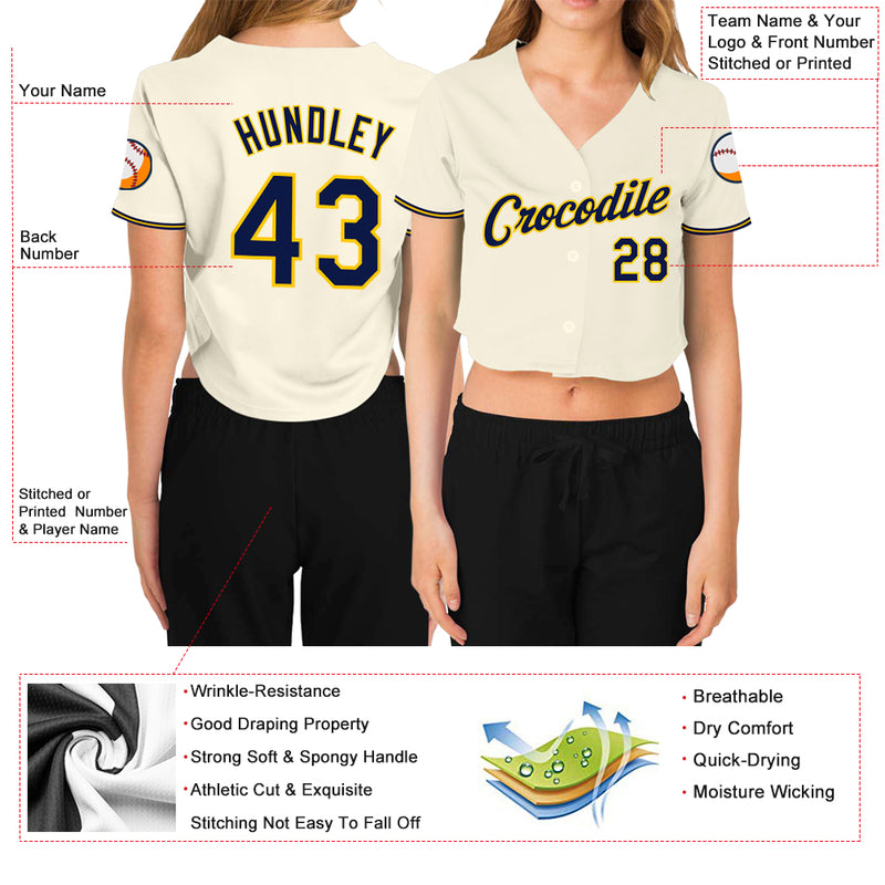 Custom Women's Cream Navy-Gold V-Neck Cropped Baseball Jersey
