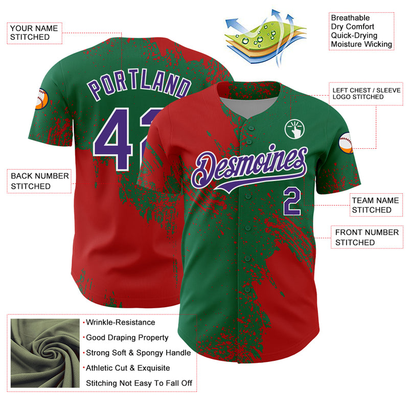 Custom Red Purple Kelly Green-White 3D Pattern Design Abstract Brush Stroke Authentic Baseball Jersey
