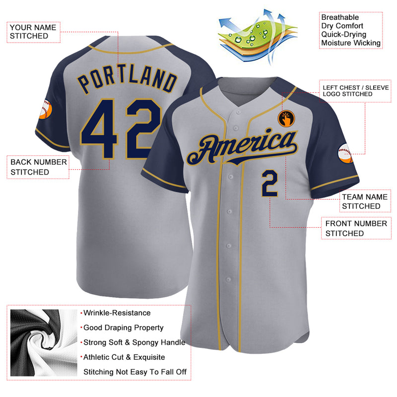 Custom Gray Navy-Old Gold Authentic Raglan Sleeves Baseball Jersey