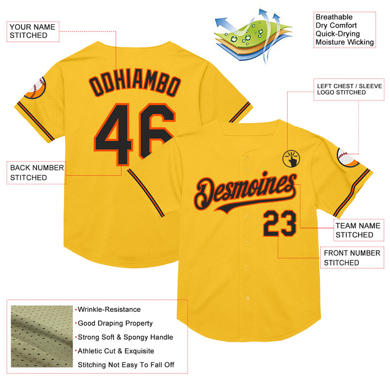 Custom Gold Black-Orange Mesh Authentic Throwback Baseball Jersey