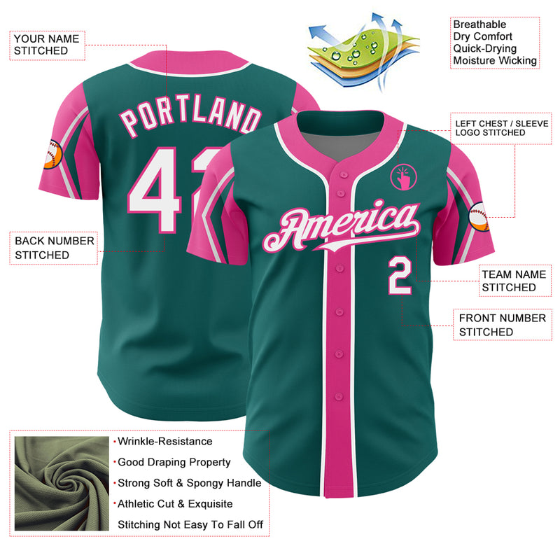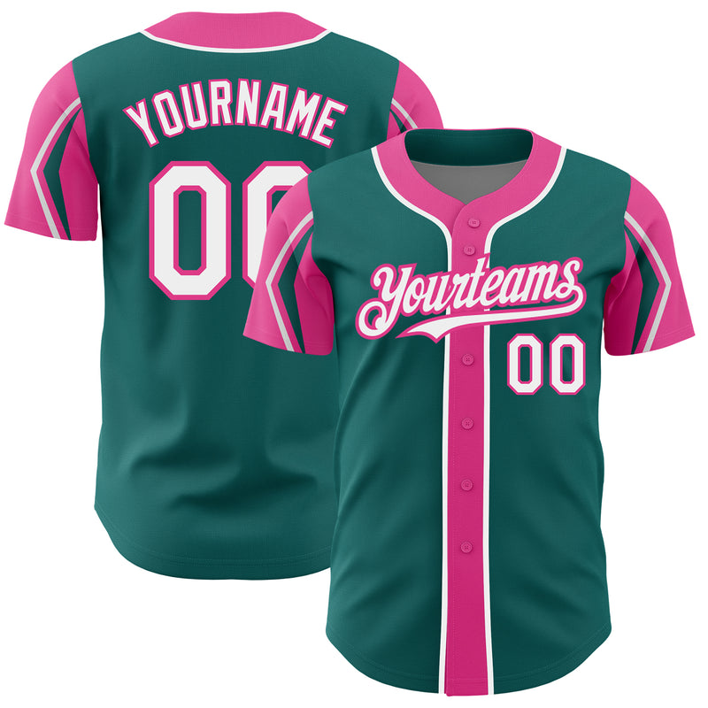 Custom Teal White-Pink 3 Colors Arm Shapes Authentic Baseball Jersey