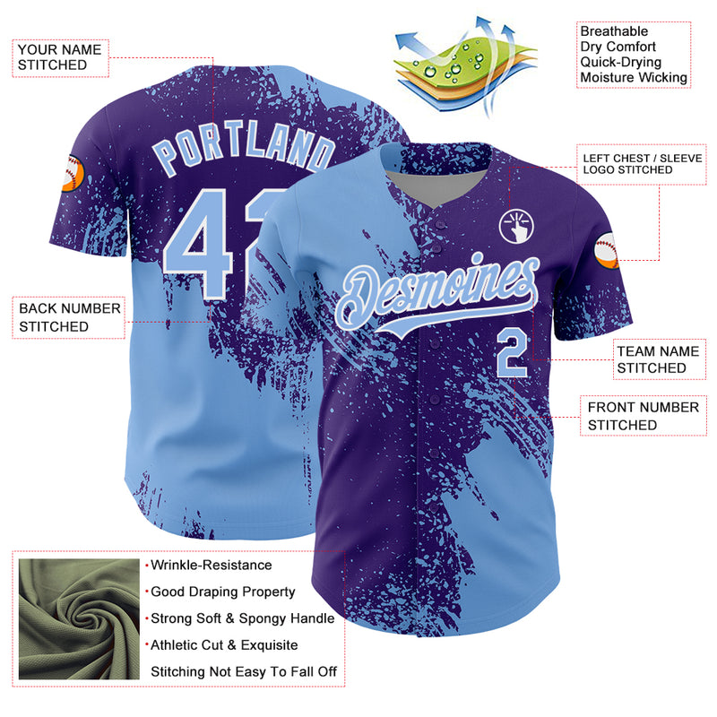 Custom Light Blue Purple-White 3D Pattern Design Abstract Brush Stroke Authentic Baseball Jersey