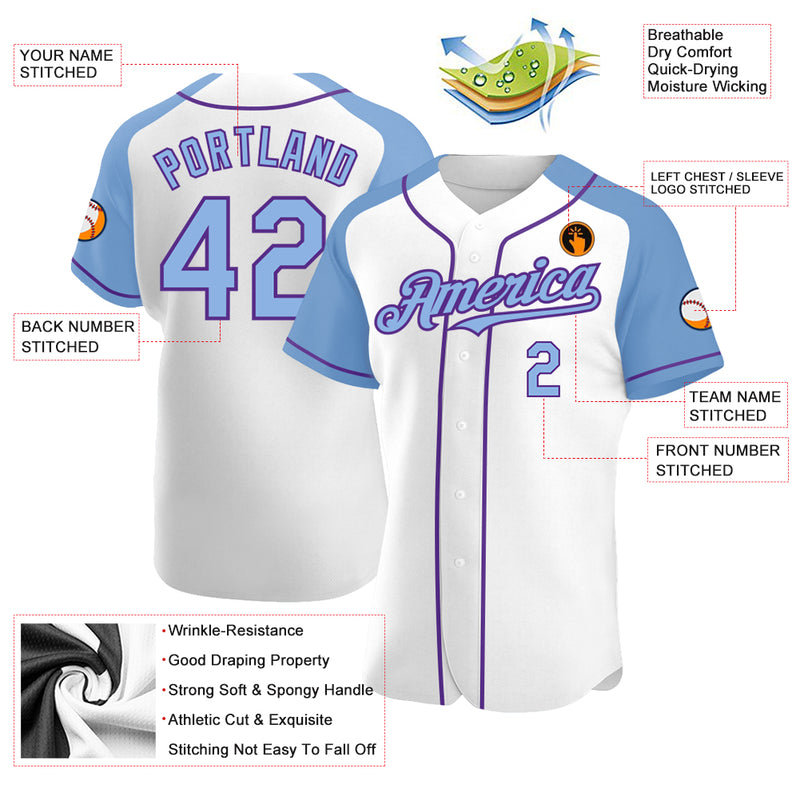 Custom White Light Blue-Purple Authentic Raglan Sleeves Baseball Jersey