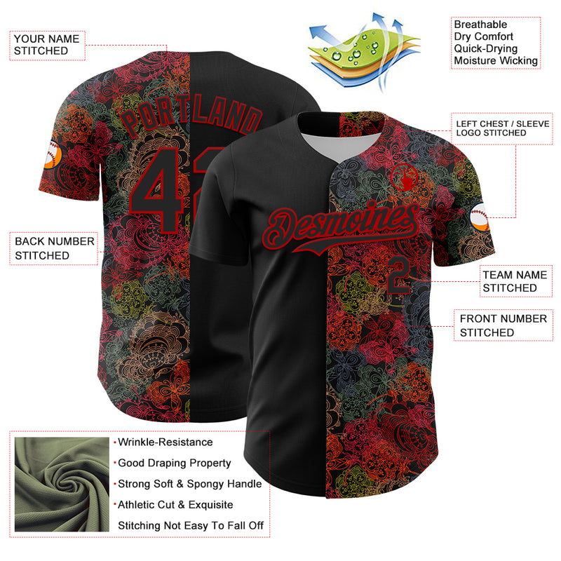 Custom Black Red 3D Pattern Design Vintage Tattoos Authentic Baseball Jersey