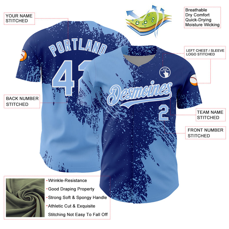 Custom Light Blue Royal-White 3D Pattern Design Abstract Brush Stroke Authentic Baseball Jersey