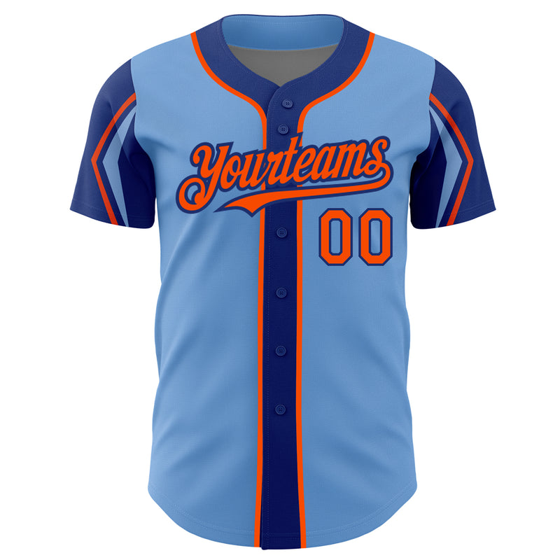 Custom Light Blue Orange-Royal 3 Colors Arm Shapes Authentic Baseball Jersey