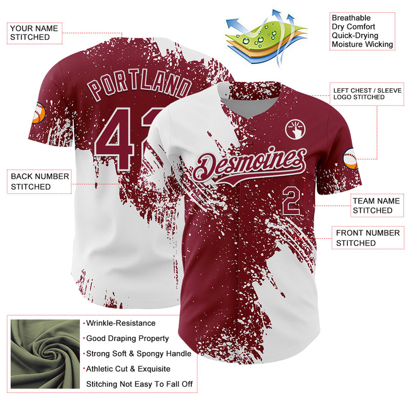 Custom White Crimson 3D Pattern Design Abstract Brush Stroke Authentic Baseball Jersey