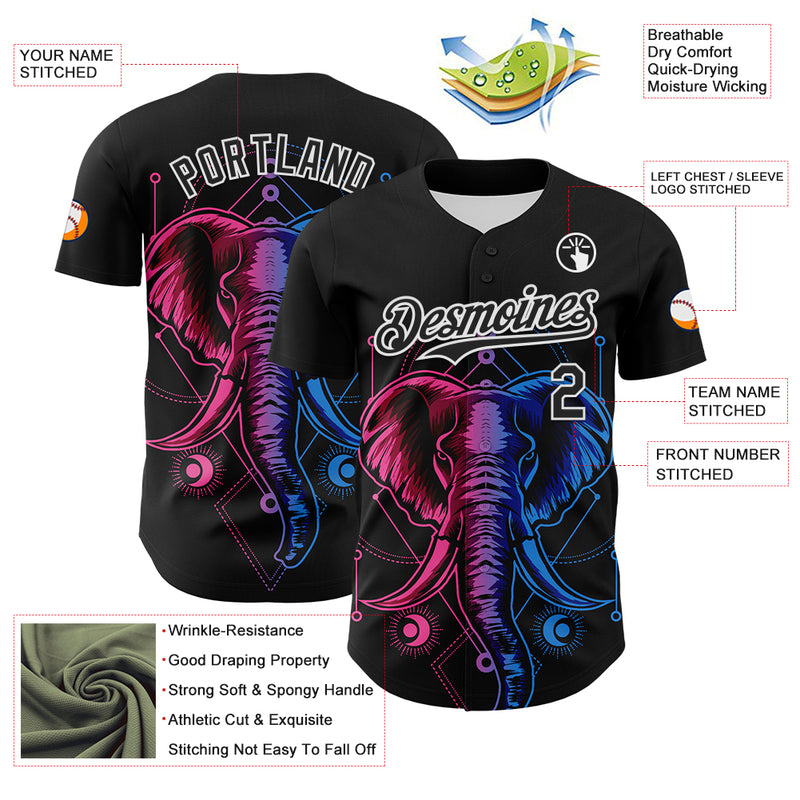 Custom Black White 3D Pattern Design Rave Psychedelic Elephant Authentic Baseball Jersey