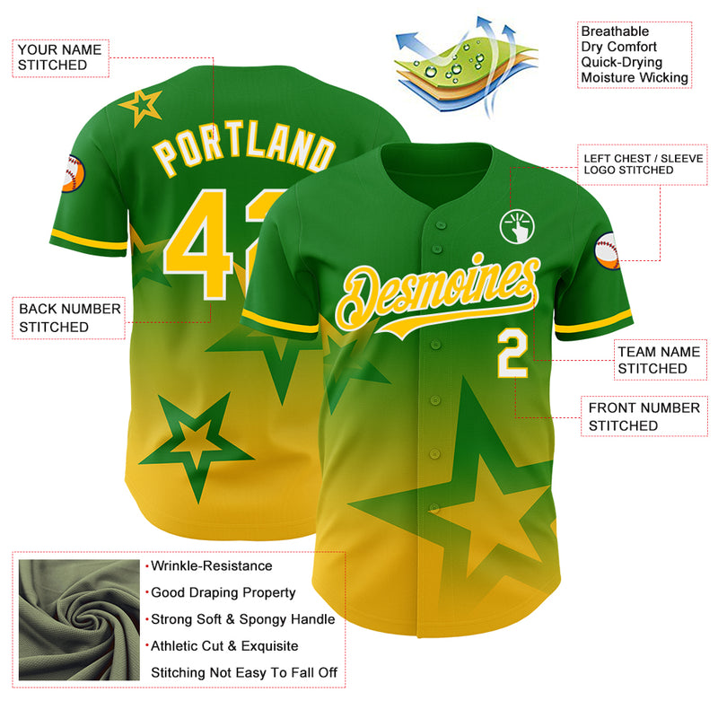 Custom Grass Green Yellow-White 3D Pattern Design Gradient Style Twinkle Star Authentic Baseball Jersey