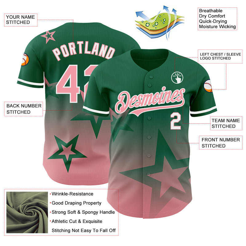 Custom Kelly Green Medium Pink-White 3D Pattern Design Gradient Style Twinkle Star Authentic Baseball Jersey