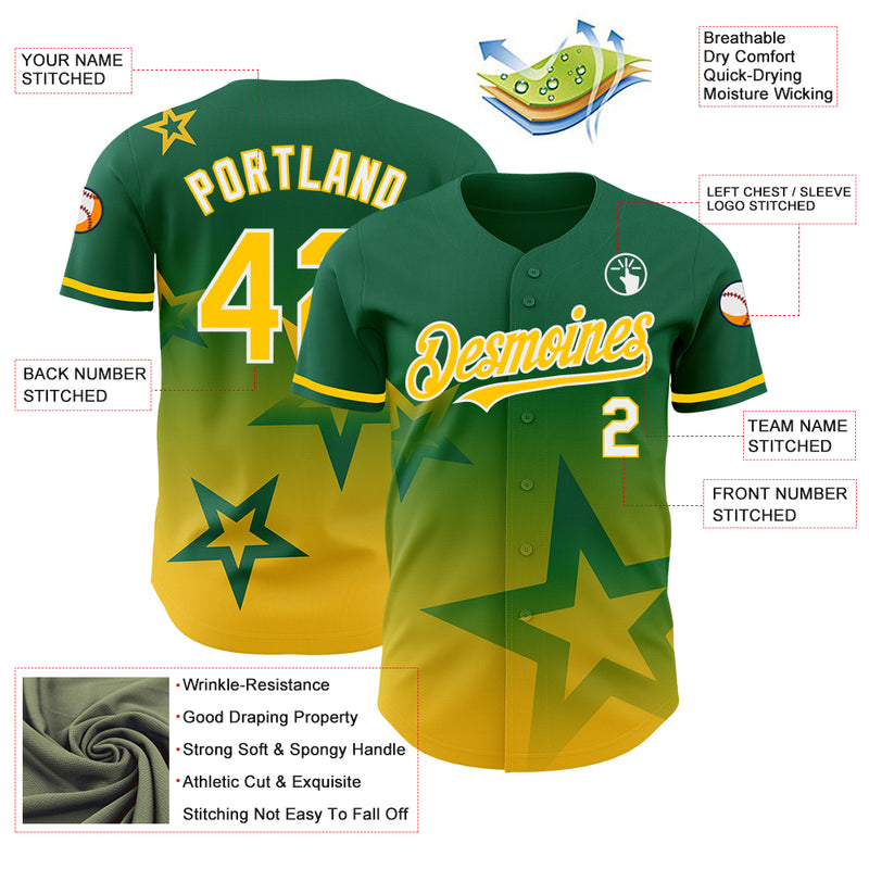 Custom Kelly Green Yellow-White 3D Pattern Design Gradient Style Twinkle Star Authentic Baseball Jersey