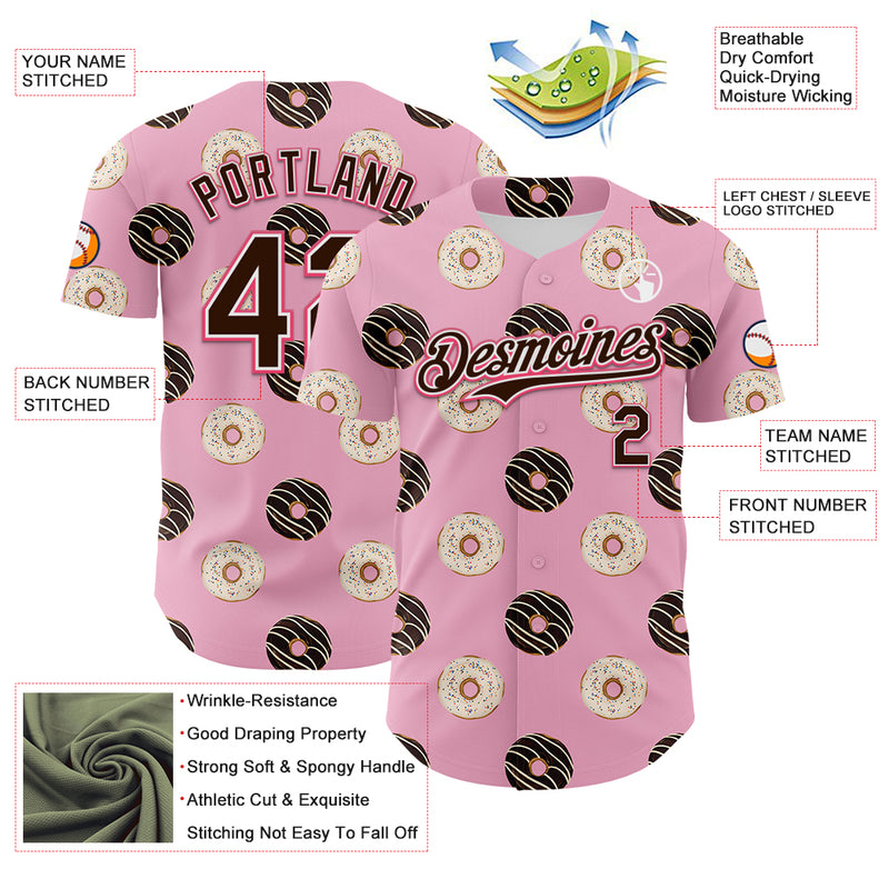 Custom Light Pink Brown-Neon Pink 3D Pattern Design Foodie Food Dessert Doughnut Authentic Baseball Jersey