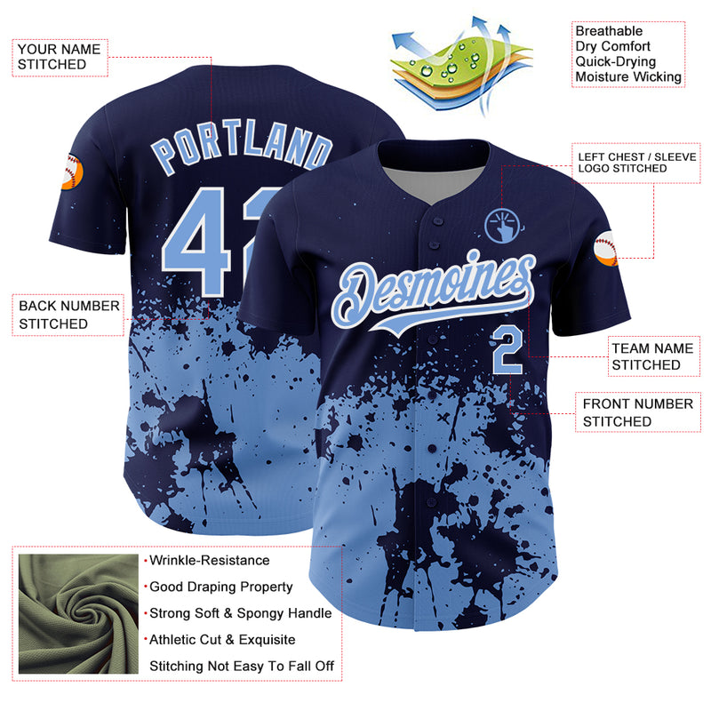 Custom Navy Light Blue-White 3D Pattern Design Abstract Splash Grunge Art Authentic Baseball Jersey