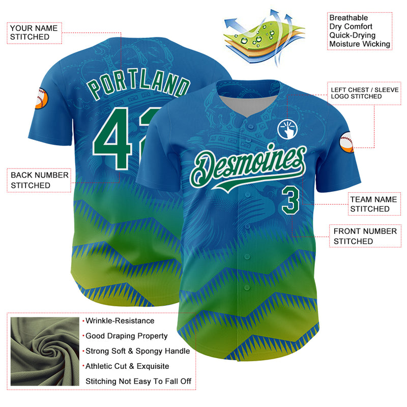 Custom Panther Blue Kelly Green-White 3D Pattern Design Animal Lion Authentic Baseball Jersey