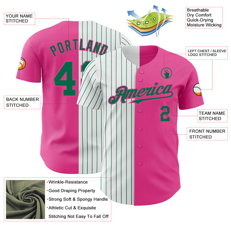 Custom Pink White-Kelly Green Pinstripe Authentic Split Fashion Baseball Jersey