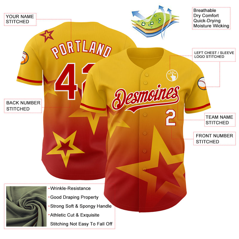 Custom Yellow Red-White 3D Pattern Design Gradient Style Twinkle Star Authentic Baseball Jersey