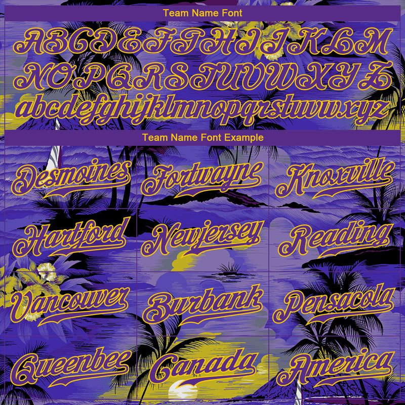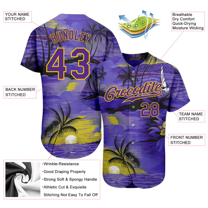 Custom Purple Yellow 3D Pattern Design Sun Beach Hawaii Palm Trees Authentic Baseball Jersey