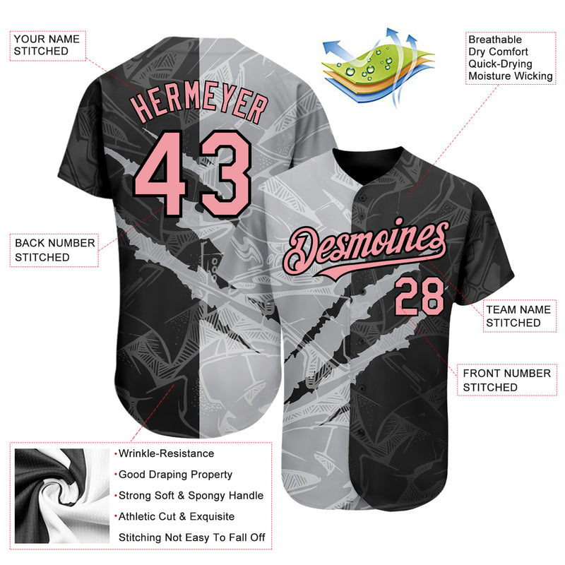 Custom Graffiti Pattern Medium Pink Black-Gray 3D Scratch Authentic Baseball Jersey
