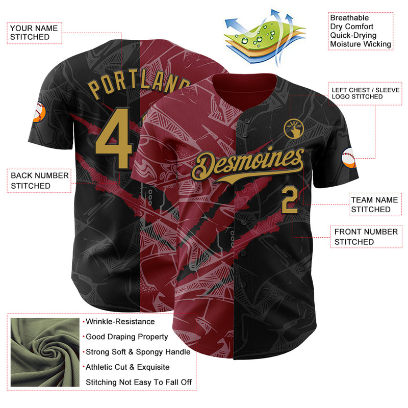Custom Graffiti Pattern Old Gold Black-Crimson 3D Scratch Authentic Baseball Jersey