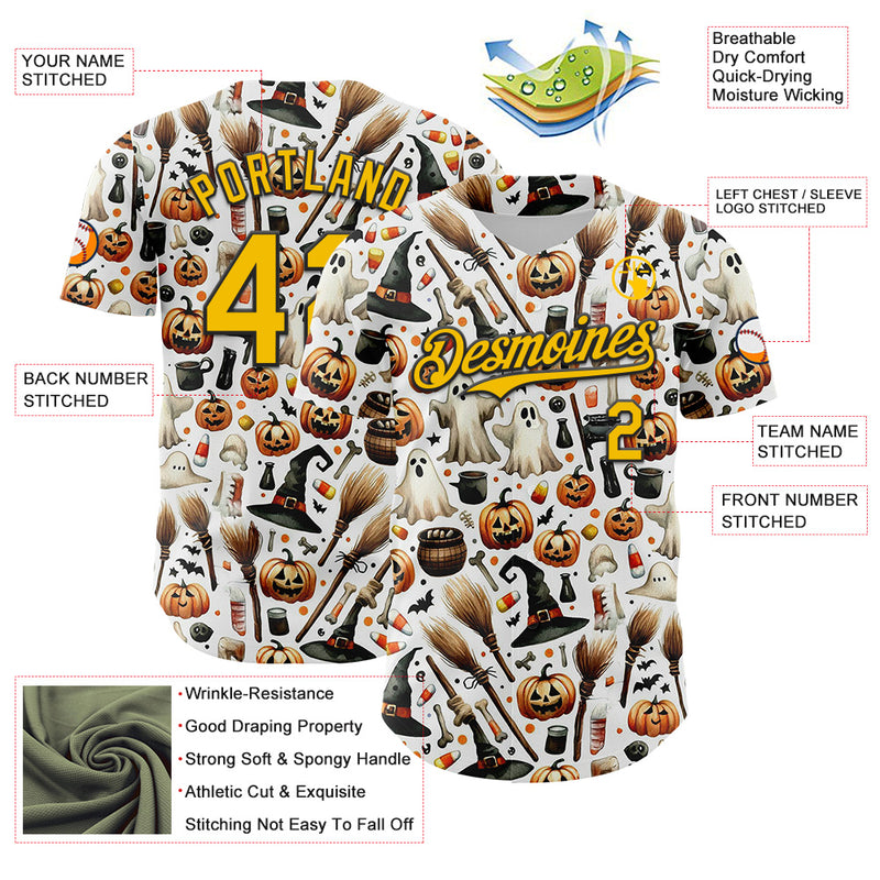 Custom White Yellow-Black 3D Halloween Spooky Pumpkin Authentic Baseball Jersey