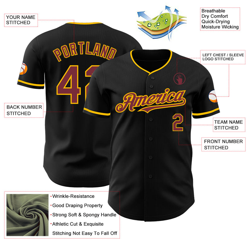 Custom Black Burgundy-Gold Authentic Baseball Jersey