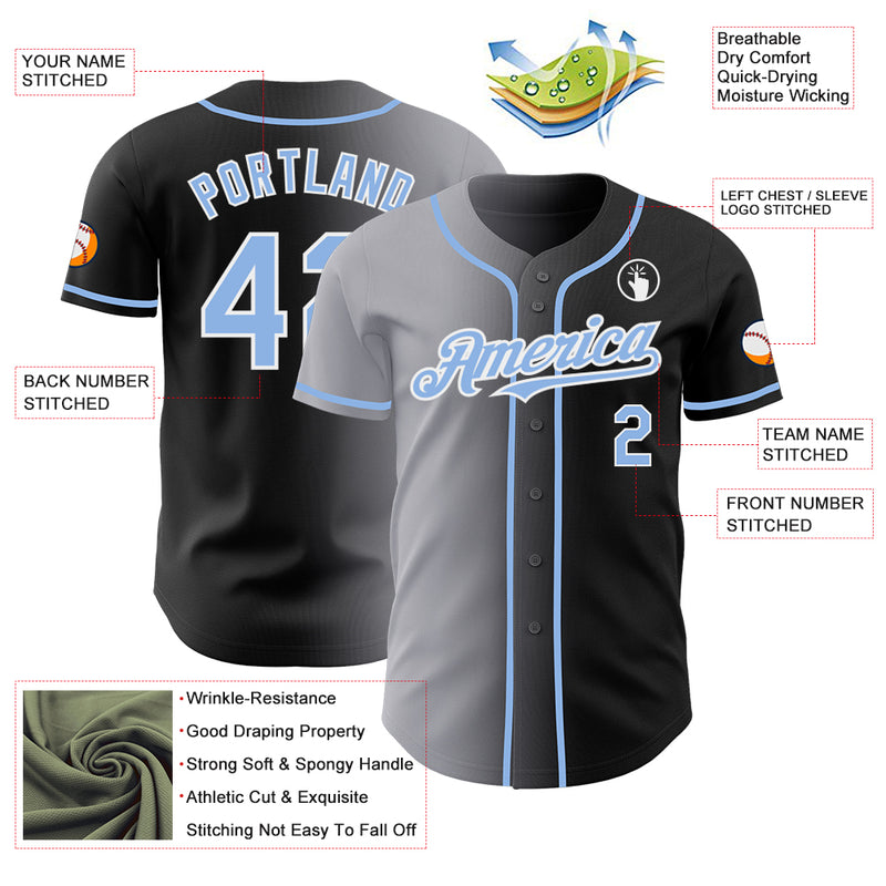 Custom Black Light Blue Gray-White Authentic Gradient Fashion Baseball Jersey