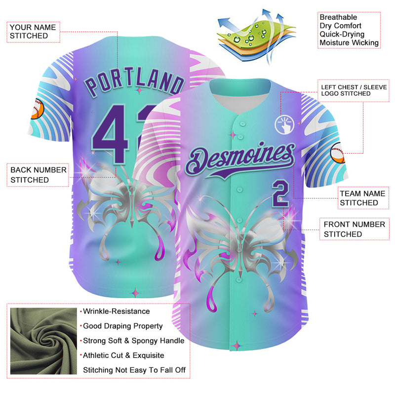 Custom Blue Purple-Ice Blue 3D Pattern Design Trippy Acid Butterfly Authentic Baseball Jersey