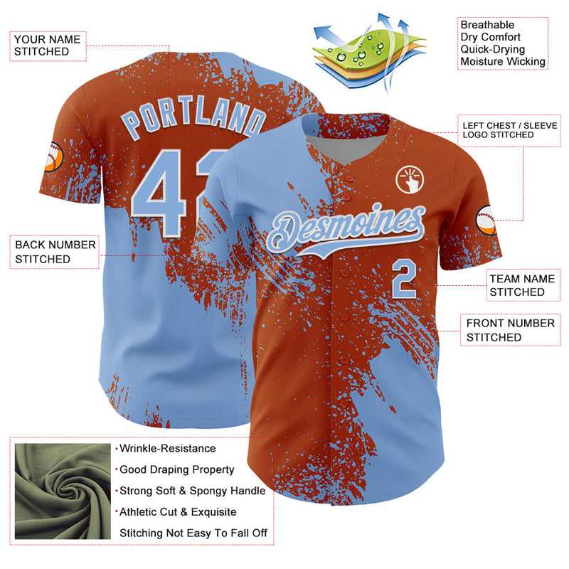 Custom Light Blue Texas Orange-White 3D Pattern Design Abstract Brush Stroke Authentic Baseball Jersey