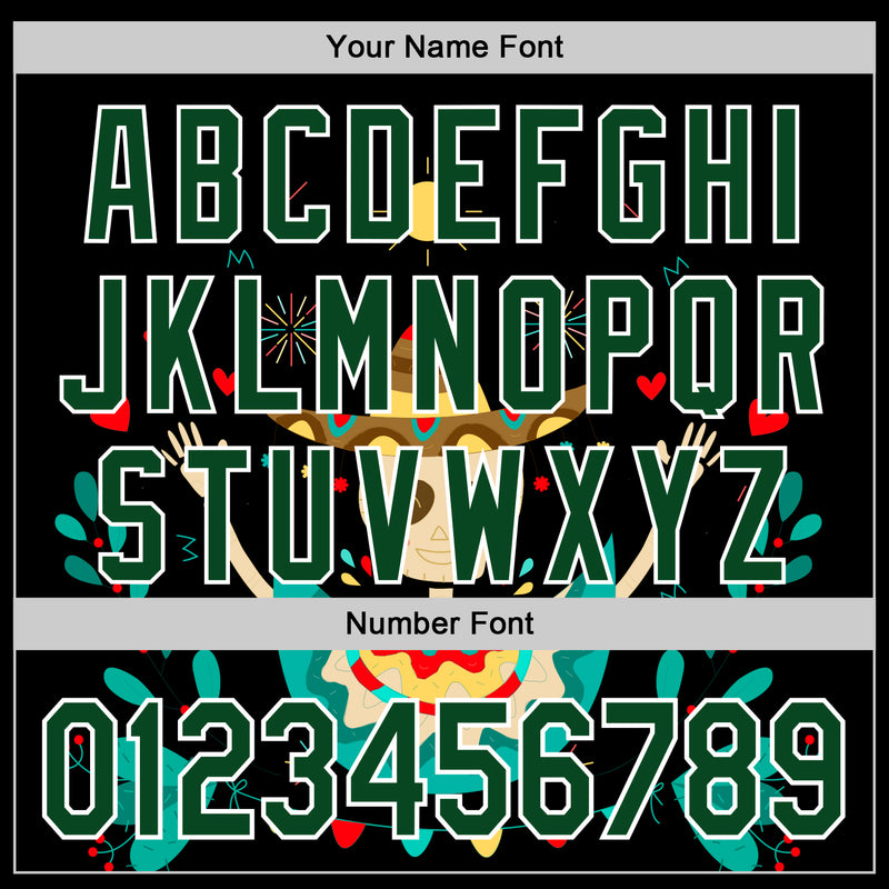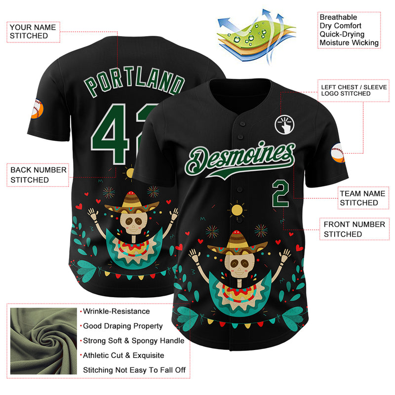 Custom Black Green-White 3D Mexican Festival Flower Skull With Sombrero Cinco de Mayo Authentic Baseball Jersey